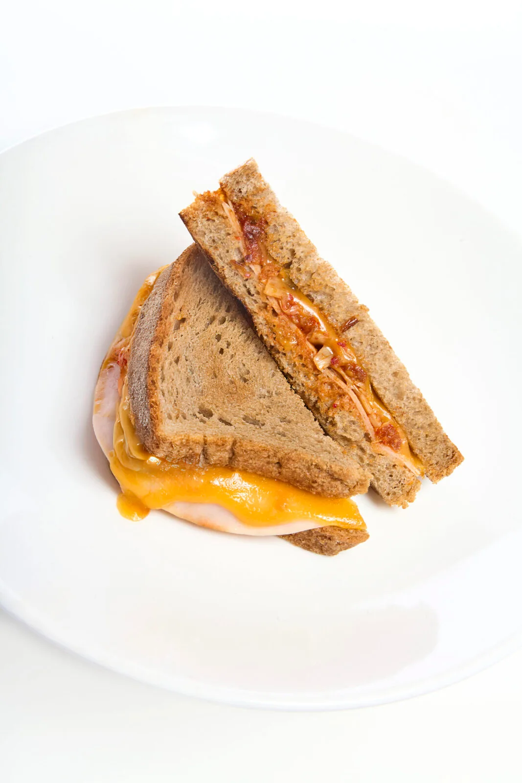 - Zunächst legen wir die vier Brotscheiben so aus, dass alles zum Zusammensetzen bereit ist. Auf zwei von ihnen legen wir eine Scheibe Käse, gefolgt von einer oder zwei Scheiben Schinken. Dann geben wir ein paar Löffel gehackte Bibap Manufaktur Kimchi Original, und lässt ihn sich auf natürliche Weise auf dem Brot verteilen. Wir beenden den Stapel mit einer weiteren Käsescheibe, bevor wir das restliche Brot darauf legen, um die Sandwiches zu schließen.